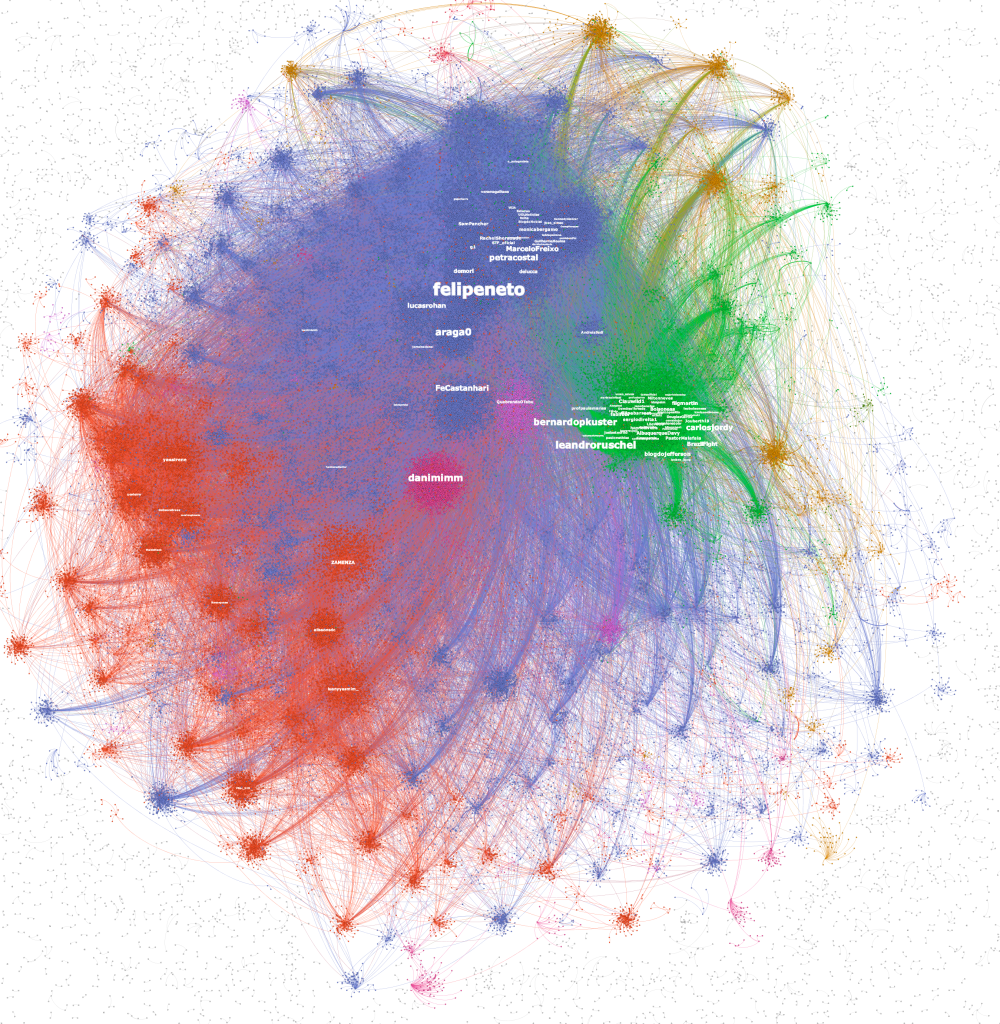 – Por fim, vale mais uma vez destacar que um agrupamento novo e cada vez mais integrado ao anti-bolsonarismo se forma a partir de clusters não ligados à política tradicional. Apresentam mais de 15% do grafo anexo e são representados majoritariamente pela cor vermelha. Não se unem ao debate lavajatista vs bolsonarismo, mas sim ao descaso federal em relação a pandemia.