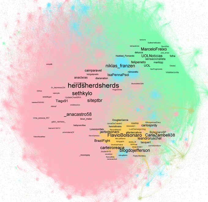 Somos 70%? Se analisarmos Bolsonaro no dia de ontem somos bem mais que isso: a rede bolsonarista se restringiu ontem a algo como 16%. É o agrupamento amarelo no grafo abaixo.