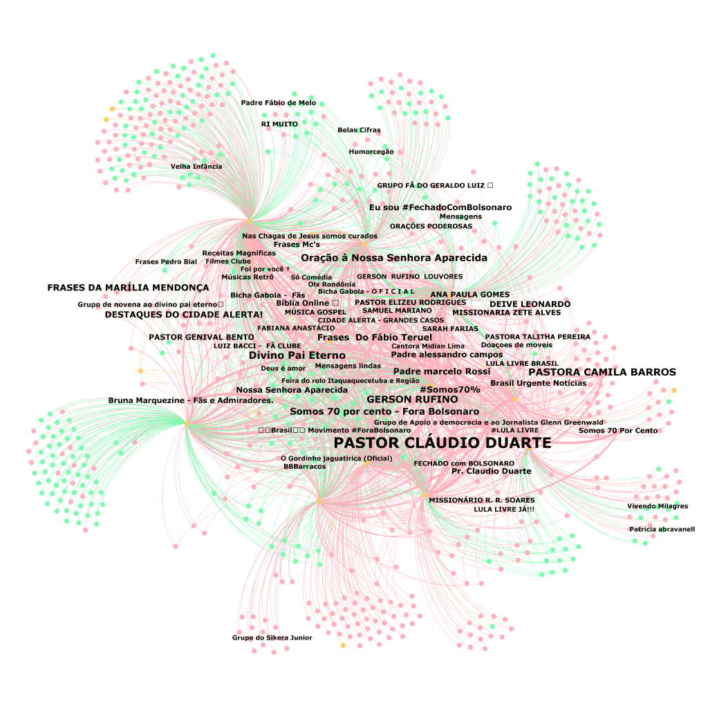 O grafo abaixo nos ajuda a entender: em vermelho os grupos utilizados para disseminar o conteúdo (+65%) e em verde, as páginas (+32%). O tamanho do nome demonstra o volume de interações produzidas nesses grupos. Ele é formado a partir dos grupos e páginas onde foram divulgadas as 10 principais notícias da última semana no portal em volume de shares.