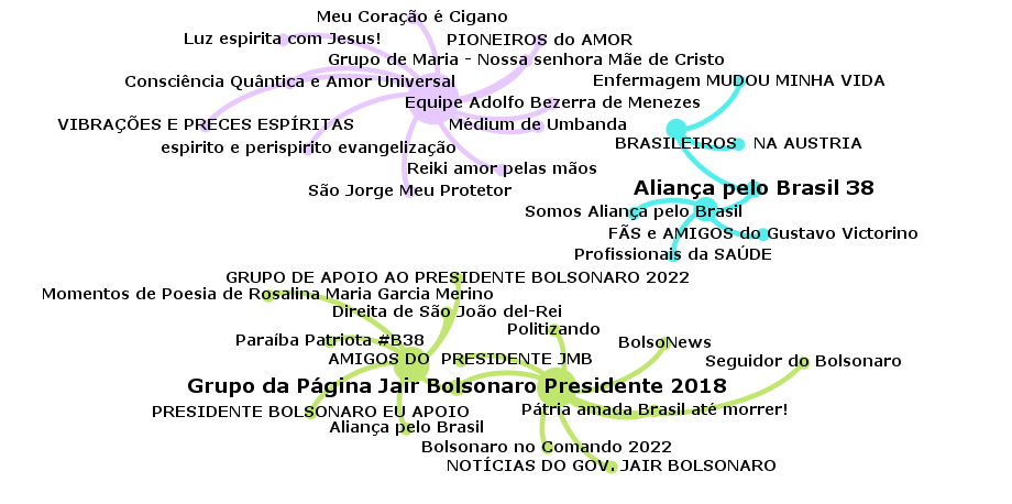 Como podemos observar, três agrupamentos significativos se mostram em um primeiro momento. O primeiro – e o maior deles é marcado por uma forte presença de páginas e grupos bolsonaristas e/ou de apoio ao prometido partido de Jair Bolsonaro, o Aliança Pelo Brasil. Já o segundo agrupamento com maior presença tem um caráter religioso, enquanto o terceiro agrupamento aqui descrito conecta profissionais da saúde a outros grupos que também denotam apoio ao suposto partido de Jair Bolsonaro no próximo período.