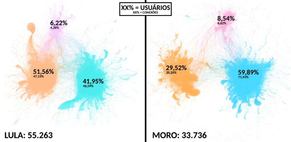 1-) O ódio contra Sérgio Moro mobiliza mais o petismo do que a defesa de Lula nesse cenário. O volume de conexões geradas ao redor das críticas a Sérgio Moro é impressionante: média de 1,19 para ataques à Sérgio Moro contra 1,11 em defesa de Lula;