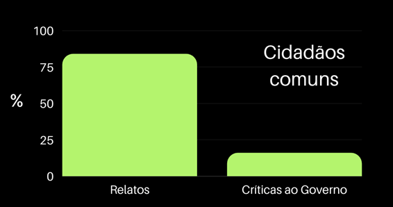 Cidadãos comuns: Os usuários que mais citaram o Pantanal no período analisado não falavam com frequência nem sobre meio ambiente, nem sobre política. Fumaça nas cidades, perdas irreparáveis, animais queimados e ameaça aos povos indígenas foram os principais motivos dessa inédita sensibilização. Assim, relatos sobre o impacto do fogo são assuntos de destaque nesse grupo.