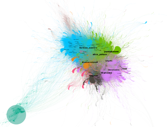 Os resultados podem ser visualizados no grafo abaixo. O agrupamento isolado (circulado) é o Bolsonarista. No centro estão unidos os cidadãos comuns, progressistas e ambientalistas que pedem por ações e medidas urgentes para salvar o Pantanal.
