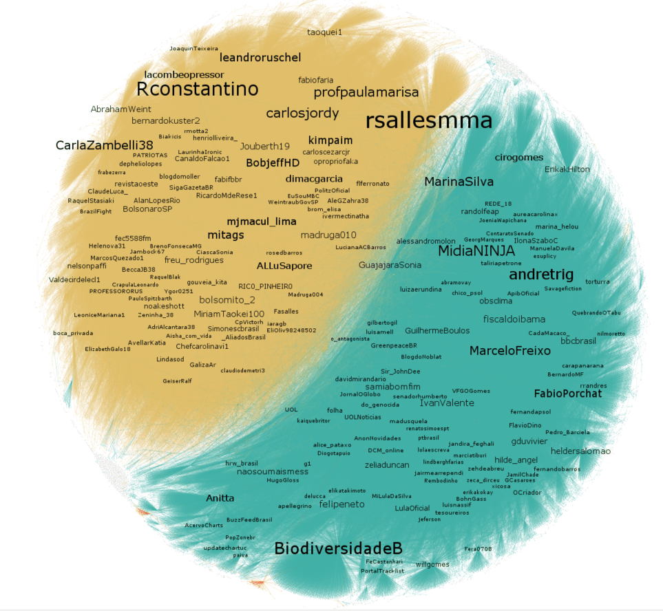 Entre #ForaSalles e #FicaSalles, a cúpula do clima intensificou o debate sobre Meio Ambiente no Brasil. O agrupamento azul é formado por políticos de esquerda e progressistas, mídia, ativistas ambientais e personalidades criticando a política ambiental Salles/Bolsonaro. Já o bege é formado pela rede Bolsonarista