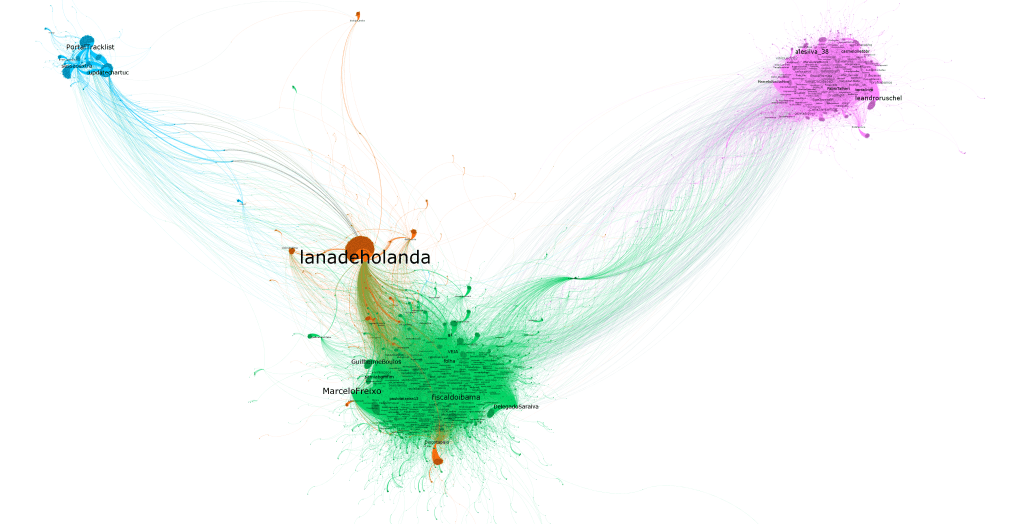 Esse grupo também compartilha notícias vinculadas pela mídia tradicional, com G1 e Veja. Já o grupo Roxo (24,14%) é composto por usuários bolsonaristas, que são contra e condenam a Operação Akuanduba, além de sua mídia própria – também bolsonarista.