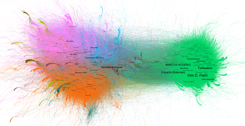 Zambelli afirmou que os bolsonaristas “vivem em uma bolha”, lamentando o isolamento do campo bolsonarista [verde]. O isolamento do bolsonarismo se contrapõe ao amplo campo de atores que dialogam, hoje, por meio do anti-bolsonarismo no Twitter [lado esquerdo do grafo].