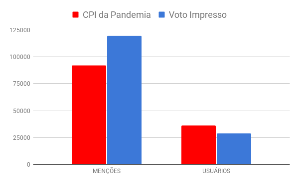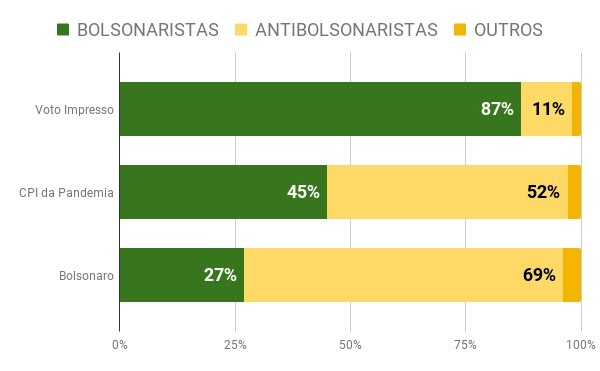No entanto, o aumento no volume de menções não foi acompanhado por um aumento proporcional no volume de usuários tratando sobre o tema, que permaneceu extremamente dependente do bolsonarismo. O tema “voto impresso” teve um volume 30% maior de menções se comparado à CPI e, ainda assim, engajou 26% de usuários a menos que o debate sobre a comissão.