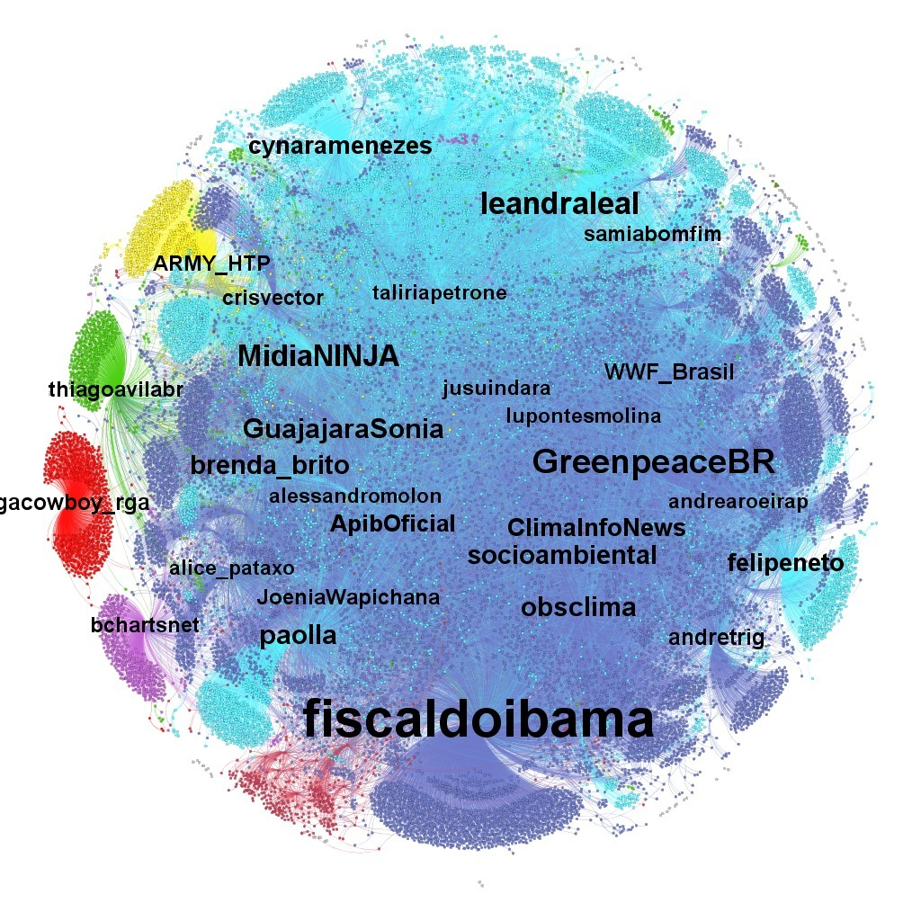 Os grupos azul claro/escuro tratam do tema igualmente: sendo contra a lei e alertando que ela pretende legalizar o roubo de terras públicas. Os riscos para as florestas e os agricultores familiares são destacados por artistas, ativistas ambientais, ONGs e membros da esquerda.