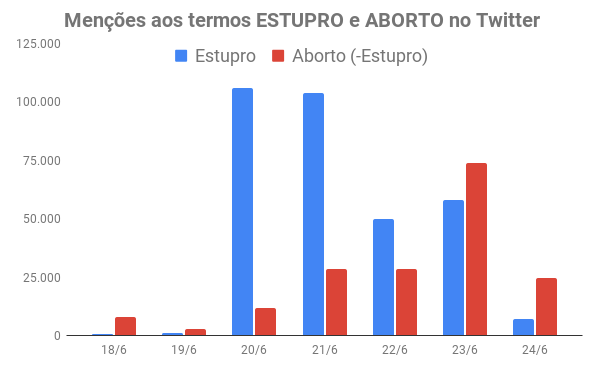 Alguns setores fazem uma manobra perversa no debate sobre a criança estuprada em SC: abordam o tema ABORTO tentando ocultar o fato de a gravidez ter sido resultado de um ESTUPRO sofrido por uma criança de 11 anos. Observem como o volume de menções ao termo ABORTO sem o termo ESTUPRO/ESTUPRADA foi impulsionado nas redes, culminando no dia 23/06 com uma thread do presidente da república utilizando essa abordagem. Bolsonaro não cita o fato de ela ter sido estuprada na primeira thread.