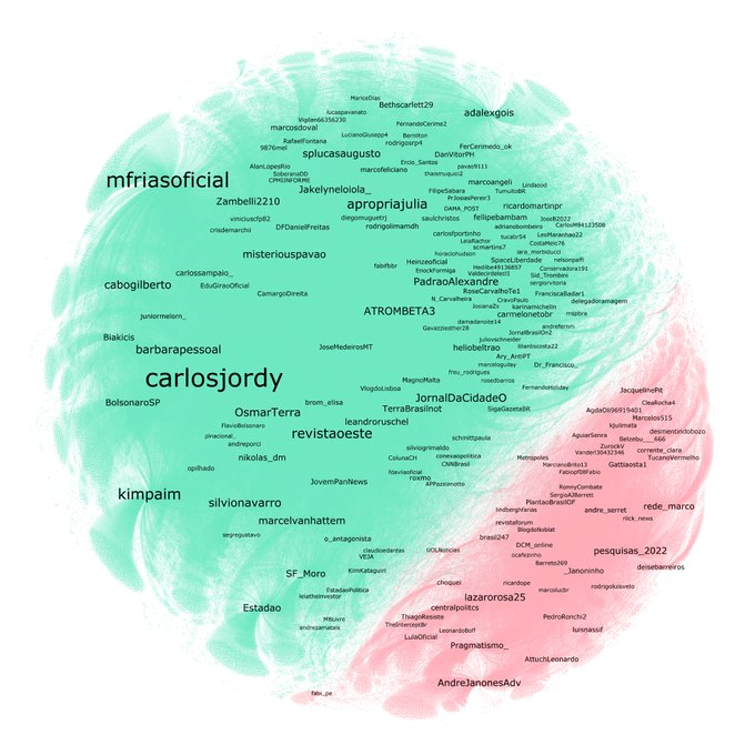 Ainda assim o bolsonarismo encontra dificuldades para fazer com que a pauta extrapole o próprio bolsonarismo: 73% dos atores que citam o tema junto ao nome de Lula no Twitter partem do bolsonarismo (verde), enquanto menos de 26% dos atores o fazem pelo viés antibolsonarista (vermelho).