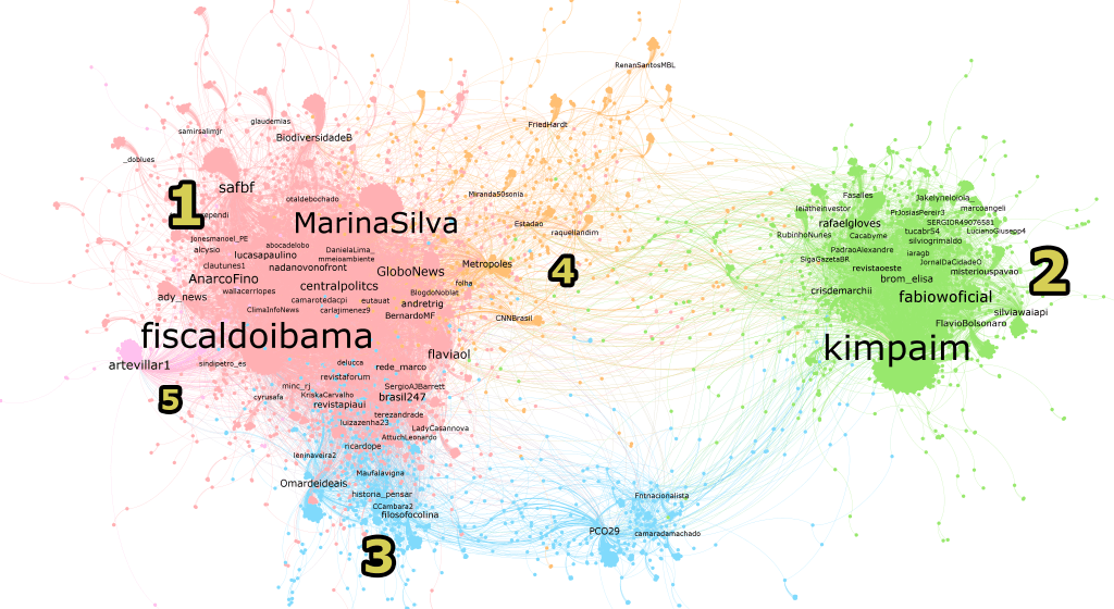 Por fim, a imprensa (4) também explora suposta crise interna do governo, mas por um viés ambientalista, aprofundando assim a percepção de conflitos. Vale destacar que o grupo 3 também critica a imprensa por considerar que a cobertura sobre o assunto tem sido “parcial”. Já atores ligados ao MBL utilizam deste cenário para explorar o tema e também atacam Marina Silva.
