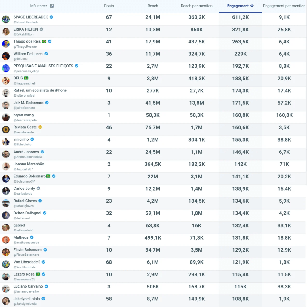 Na tabela abaixo observamos os atores que mais geraram engajamento ao citarem Jair Bolsonaro durante esse período. Entre atores bolsonaristas como o Space Liberdade e Jair Bolsonaro estão perfis antibolsonaristas como Erika Hilton, Thiago dos Reis e William de Lucca. No entanto, se olharmos com mais atenção os outros listados surge a pergunta: onde estão figuras centrais do bolsonarismo? Onde estão atores como Tarcísio, Nikolas Ferreira, Gustavo Gayer e tantos outros?